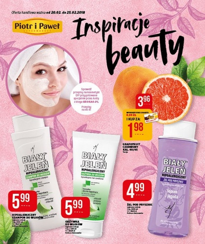 'Inspiracja beauty' - nowa gazetka promocyjna sieci sklepów Piotr i Paweł. Polecane promocje z gazetki Piotr i Paweł: Hipoalergiczny szampon do włosów Biały Jeleń 300 ml - 5,99 zł. Odżywka do włosów Biały Jeleń 200 ml - 5,99 zł.…
