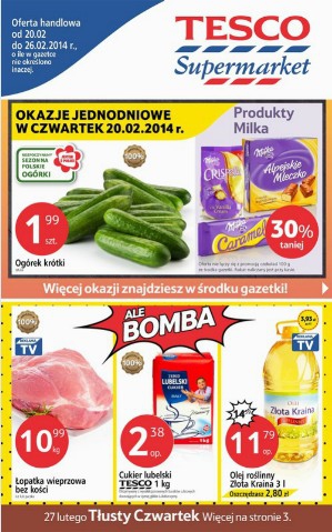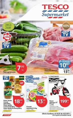 Nowa gazetka promocyjna Tesco. Polecane promocje z gazetki Tesco: Polski ogórek krótki 1 kg - 7,99 zł. Proszek do prania E 3,3 kg - 13,20 zł. Rower dziecięcy T'Cool 12" - 199 zł. Oferta ważna od 26.02…