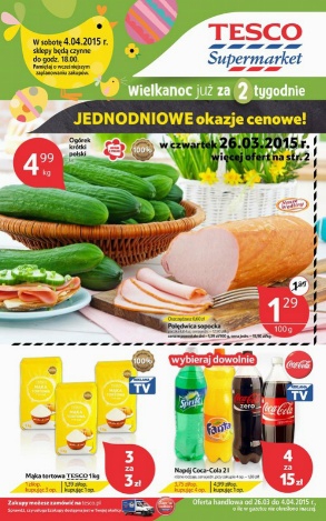 Nowa gazetka promocyjna Tesco. Polecane promocje z gazetki Tesco: Ogórek krótki polski 1 kg - 4,99 zł. Polędwica sopocka 100 g - 1,29 zł. Mąka tortowa Tesco 3x1 kg - 3 zł. Oferta ważna od 26.03 do…