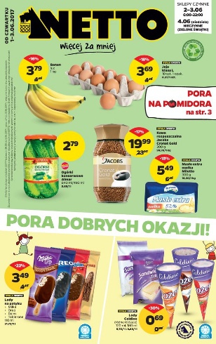 {loadposition linkNetto} Nowa gazetka promocyjna Netto - "Pora dobrych okazji!". Polecane promocje z gazetki Netto: Banany 1 kg - 3,79 zł. Jaja klasa L 10 sztuk - 3,69 zł. Ogórki konserwowe Almar 840 g - 2,79 zł. …