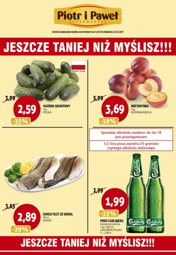 Nowa gazetka promocyjna sieci sklepów Piotr i Paweł - "Jeszcze taniej niż myślisz!!!". Polecane promocje z gazetki Piotr i Paweł: Ogórki gruntowe 1 kg - 2,59 zł. Nektarynki 1 kg - 3,69 zł. Filet z dorsza…