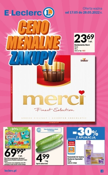 {loadposition linkEleclerc} 'Cenomenalne zakupy' - nowa gazetka promocyjna sieci handlowej E.Leclerc. Polecane promocje z gazetki E.Leclerc: Bombonierka Merci 400 g - 23,69 zł. Ogórki szklarniowe 1 kg - 4,99 zł*. Mieszanka studencka Tokapi 200 g - 7,99 zł. …