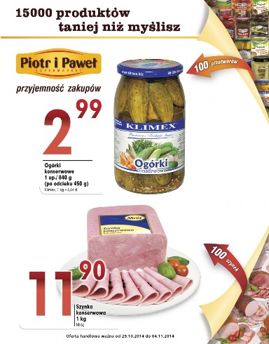 Nowa gazetka promocyjna sieci sklepów Piotr i Paweł - "15 000 produktów taniej niż myślisz". Polecane promocje z gazetki Piotr i Paweł: Ogórki konserwowe 840 g - 2,99 zł. Szynka konserwowa 1 kg - 11,90 zł. Polska młoda…