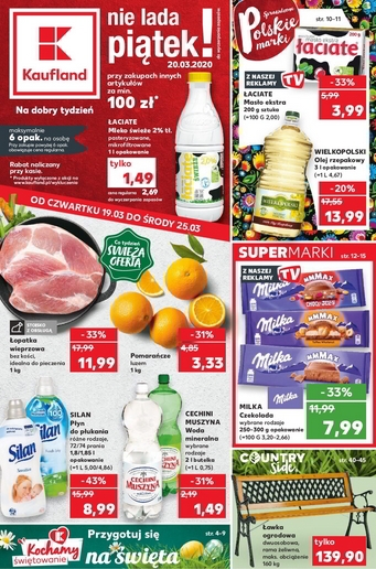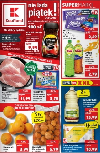 Nowa gazetka promocyjna sieci marketów Kaufland. Polecane promocje z gazetki Kaufland: Masło ekstra Łaciate 200 g - 3,99 zł. Olej rzepakowy Wielkopolski 3 L - 13,99 zł. Czekolada Milka 300 g - 7,99 zł. …