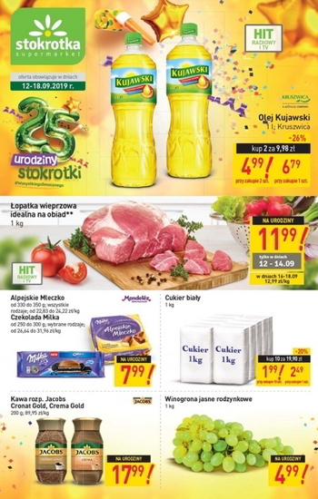 '25. urodziny' - nowa gazetka promocyjna sieci sklepów Stokrotka. Polecane promocje z gazetki Stokrotka: Olej Kujawski 2x1 L - 9,98 zł. Cukier biały 10x1 kg - 19,90 zł. Winogrona jasne rodzynkowe 1 kg - 4,99 zł. …