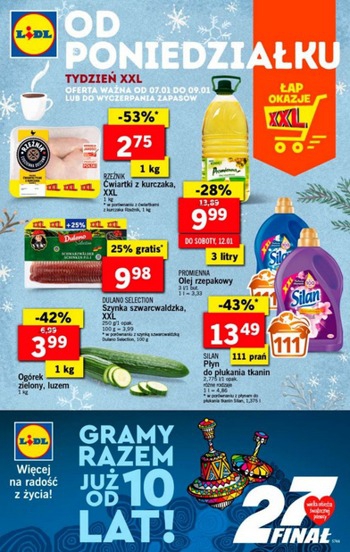 {loadposition linkLidl1} 'Od poniedziałku tydzień XXL' - nowa gazetka promocyjna sieci sklepów Lidl. Polecane promocje z gazetki sklepów Lidl: Ćwiartka z kurczaka Rzeźnik 1 kg - 2,75 zł. Olej rzepakowy Promienna 3 L - 9,99 zł. Szynka szwarcwaldzka…