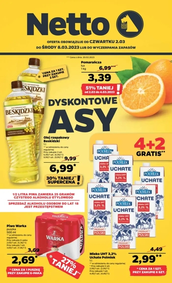 {loadposition linkNetto3} 'Dyskontowe asy' - nowa gazetka promocyjna sieci sklepów Netto. Polecane promocje z gazetki Netto: Olej rzepakowy Beskidzki Bielmar - 6,99 zł*. Pomarańcze 1 kg - 3,39 zł**. Mleko Uchate Polmlek 1 L - 29 zł***. *…