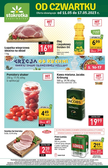 'Od czwartku' - nowa gazetka promocyjna sieci sklepów Stokrotka. Polecane promocje z gazetki Stokrotka: Łopatka wieprzowa idealna na obiad 1 kg - 16,99 zł. Olej rzepakowy Golden Oil 1 L - 6,99 zł*. Kawa mielona Jacobs Kronung 500 g…