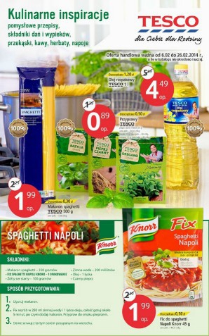 Nowy katalog Tesco "Kulinarne Inspiracje", a w nim pomysłowe przepisy, składniki dań i wypieków, a także przekąski, kawy, herbaty, napoje. Polecane promocje z katalogu Tesco: Fix do spaghetti Napoli Knorr 45 g - 1,99 zł. Makaron spaghetti Tesco…