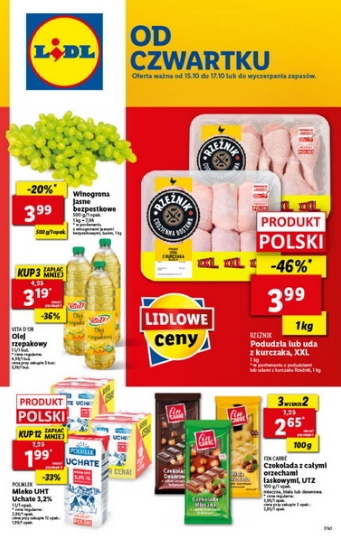 {loadposition linkLidl2} 'Od czwartku' - nowa gazetka promocyjna sieci sklepów Lidl. Polecane promocje z gazetki sklepów Lidl: Podudzia lub uda z kurczaka Rzeźnik 1 kg - 3,99 zł. Winogrona jasne bezpestkowe 1 kg - 3,99 zł. Olej rzepakowy Vita…