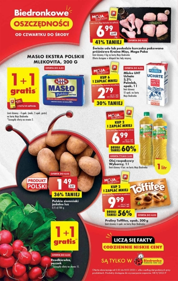 {loadposition linkBiedronka2} 'Biedronkowe oszczędności od czwartku do środy' - nowa gazetka promocyjna sieci sklepów Biedronka. Polecane promocje z gazetki sieci Biedronka: Polskie ziemniaki jadalne 1 kg - 1,49 zł*. Mleko Uchate Polmlek 1 L - 2,79 zł**. Olej rzepakowy…