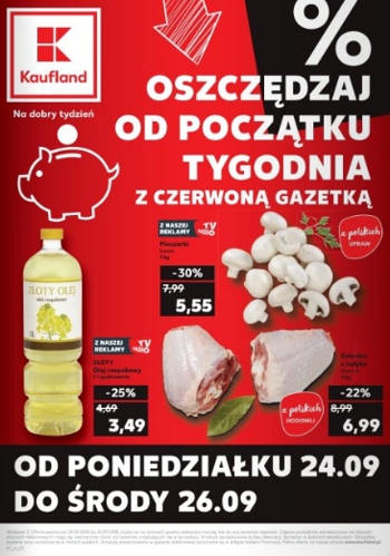 {loadposition linkKaufland} 'Oszczędzaj od początku tygodnia z czerwoną gazetką' - nowa gazetka promocyjna sieci marketów Kaufland. Polecane promocje z gazetki Kaufland: Olej rzepakowy Złoty 1 L - 3,49 zł. Pieczarki 1 kg - 5,55 zł. Golonka z…