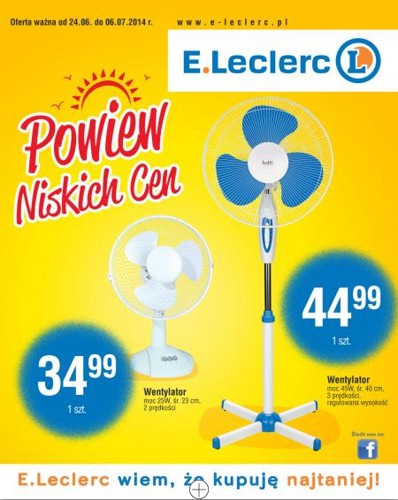 {loadposition linkEleclerc} Nowa gazetka promocyjna marketu E.Leclerc - "Powiew niskich cen". Polecane promocje z gazetki E.Leclerc: Wentylator 25 W - 34,99 zł. Olej silnikowy Lotos 10W40 5 L - 49,99 zł. Pokrowiec na fotel samochodowy - 21,99 zł. …