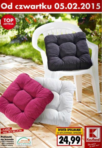 {loadposition linkKaufland} Nowa gazetka promocyjna marketu Kaufland - "TOP-Artykuł". Polecane promocje z gazetki Kaufland: Poduszki na krzesło 4 sztuki - 24,99 zł. Olej silnikowy 15W-40 5 L - 49,99 zł. Lakier do grzejników 400 ml - 8,99 zł. …
