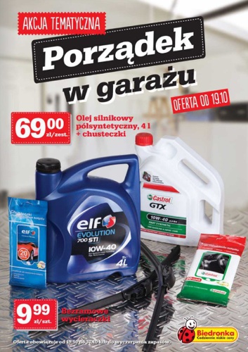 {loadposition linkBiedronka} Nowa gazetka promocyjna sieci handlowej Biedronka - "Porządek w garażu". Polecane promocje z gazetki sieci Biedronka: Olej silnikowy półsyntetyczny 4 L - 69 zł. Bezramowe wycieraczki - 9,99 zł. Kable rozruchowe - 19,99 zł. Oferta ważna…