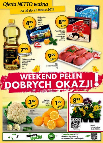 {loadposition linkNetto} Nowa gazetka promocyjna Netto - "Weekend pełen dobrych okazji!". Polecane promocje z gazetki Netto: Filet z udźca kurczaka 1 kg - 9,99 zł. Olej słonecznikowy z pierwszego tłoczenia Kunsagi 2 L - 7,99 zł. Ptasie Mleczko…