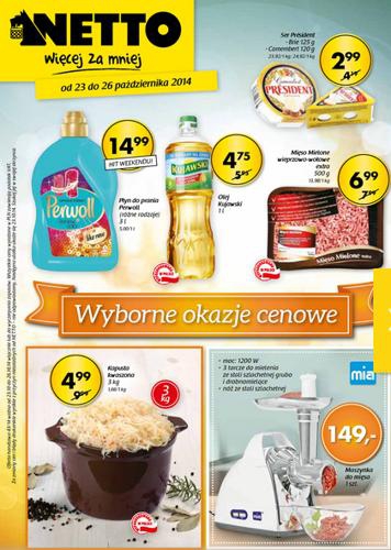{loadposition linkNetto} Nowa gazetka promocyjna Netto - "Wyborne okazje cenowe". Polecane promocje z gazetki Netto: Olej Kujawski 1 L - 1,89 zł. Ser President camembert 120 g - 2,99 zł. Płyn do prania Perwoll 3 L - 14,99…