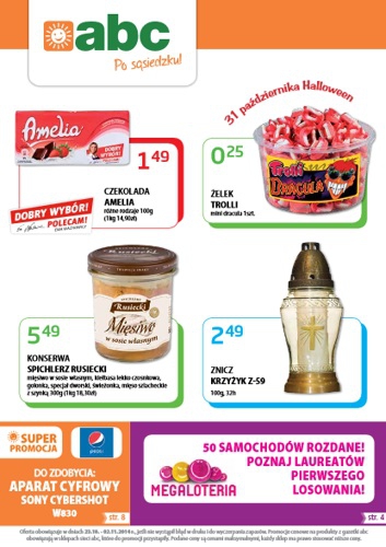 Nowa gazetka promocyjna sklepów ABC. Polecane promocje z gazetki ABC: Czekolada Amelia 100 g - 1,49 zł. Znicz Krzyżyk 100 g - 2,49 zł. Olej Kujawski 1 L - 5,79 zł. Oferta ważna od 23.10 do 2.11…