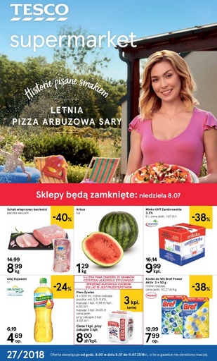 'Letnia pizza arbuzowa Sary - Historie pisane smakiem' - nowa gazetka promocyjna sieci sklepów Tesco. Polecane promocje z gazetki Tesco: Schab wieprzowy bez kości 1 kg - 8,99 zł. Arbuz 1 kg - 1,29 zł. Olej…