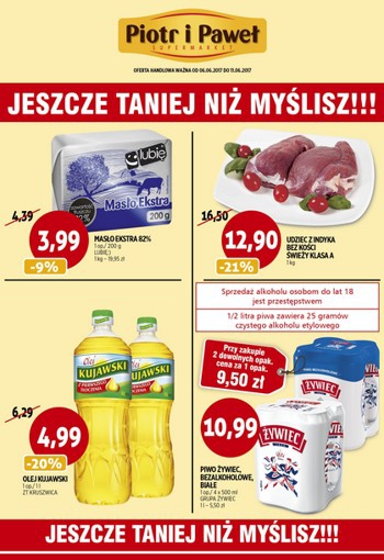 Nowa gazetka promocyjna sieci sklepów Piotr i Paweł - "Jeszcze taniej niż myślisz!!!". Masło Ekstra 200 g - 3,99 zł. Udziec z indyka bez kości 1 kg - 12,90 zł. Olej Kujawski 1 L - 4,99 zł.…