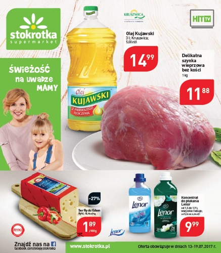 Nowa gazetka promocyjna sieci handlowej Stokrotka - "Świeżość na uwadze mamy". Polecane promocje z gazetki Stokrotka: Delikatna szynka wieprzowa bez kości 1 kg - 11,88 zł. Olej Kujawski 3 L - 14,99 zł. Ser Rycki Edam 100…