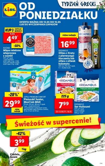 {loadposition linkLidl1} 'Od poniedziałku tydzień grecki' - nowa gazetka promocyjna sieci sklepów Lidl. Polecane promocje z gazetki sklepów Lidl: Mięso mielone wieprzowe z szynki Rzeźnik 3x500 g - 13,47 zł. Oliwa z Krety z pierwszego tłoczenia Eridanous 500 ml…