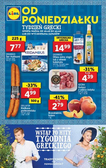 {loadposition linkLidl1} 'Od poniedziałku tydzień grecki' - nowa gazetka promocyjna sieci sklepów Lidl. Polecane promocje z gazetki sklepów Lidl: Ser Halloumi z Cypru Eridanous 225 g - 7,99 zł. Oliwa z Krety z pierwszego tłoczenia 500 ml lub oliwa…