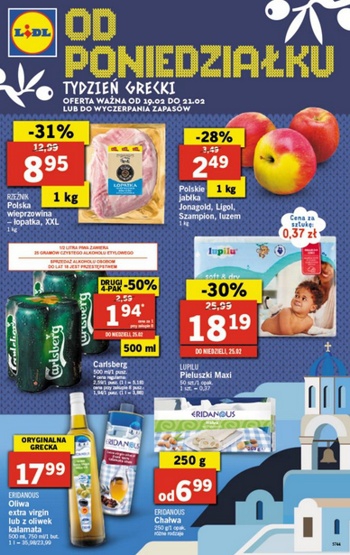 {loadposition linkLidl1} 'Od poniedziałku tydzień grecki' - nowa niebieska gazetka promocyjna sieci sklepów Lidl. Polecane promocje z gazetki sklepów Lidl: Oliwa extra virgin lub z oliwek kalamata Eridanous - 17,99 zł. Chałwa Eridanous 250 g - 6,99 zł. …