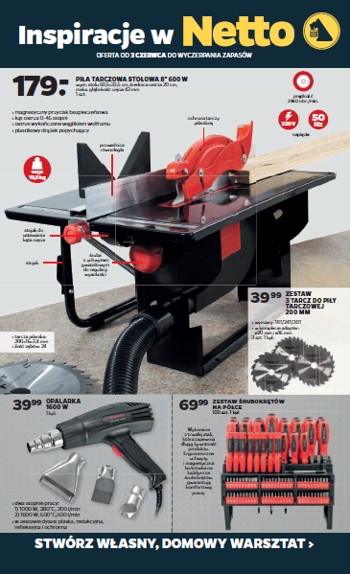 {loadposition linkNetto} 'Stwórz własny, domowy warsztat' - nowa gazetka promocyjna sieci sklepów Netto. Polecane promocje z gazetki Netto: Piła tarczowa stołowa 8" 600 W - 179 zł. Opalarka 1600 W - 39,999 zł. Zestaw śrubokrętów na półce 100…