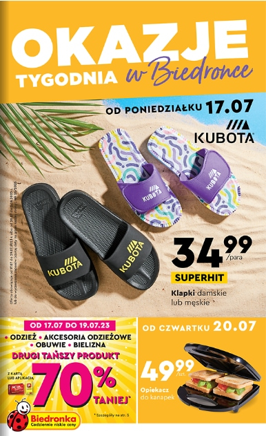 {loadposition linkBiedronka5} 'Okazje tygodnia' - nowa gazetka promocyjna sieci sklepów Biedronka. Polecane promocje z gazetki sieci Biedronka: Klapki damskie lub męskie Kubota - 34,99 zł. Opiekacz do kanapek - 49,99 zł*. Szorty kąpielowe męskie Kubota - 39,99 zł. …