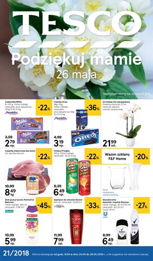'Podziękuj mamie' - nowa gazetka promocyjna sieci sklepów Tesco. Polecane promocje z gazetki Tesco: Czekolada Milka 100 g - 2,79 zł. Ciastka Oreo różne rodzaje - 3,19 zł. Orchidea mix dwupędowa - 21,99 zł. Oferta…