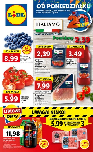 {loadposition linkLidl1} 'Od poniedziałku smaki w stylu włoskim' - nowa gazetka promocyjna sieci sklepów Lidl. Polecane promocje z gazetki sklepów Lidl: Pomidorki wiśniowe w soku pomidorowym Italiamo 400 g - 2,39 zł. Pomidory rozdrobnione Italiamo 700 ml - 3,49…