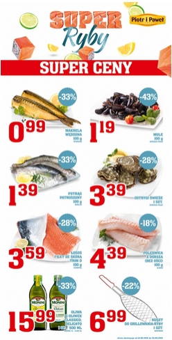 Nowa gazetka promocyjna sieci sklepów Piotr i Paweł - "Super ryby". Polecane promocje z gazetki Piotr i Paweł: Makrela wędzona 100 g - 0,99 zł. Mule 100 g - 1,19 zł. Ostrygi świeże 1 sztuka - 3,39 zł.…