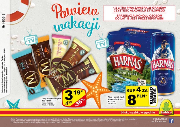 Nowa gazetka promocyjna sieci sklepów Żabka - "Powiew wakacji". Polecane promocje z gazetki Żabka: Lody Magnum Algida 100 ml - 3,19 zł. Piwo Harnaś 4x500 ml - 8 zł. Pączek z cukrem pudrem 75 g - 0,99 zł.…
