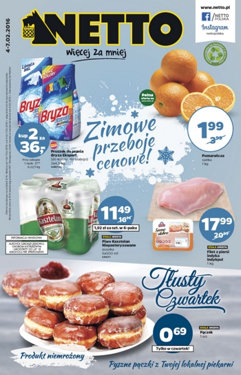 {loadposition linkNetto} Nowa gazetka promocyjna Netto - "Zimowe przeboje cenowe!". Polecane promocje z gazetki Netto: Proszek do prania Bryza Ekstra 2x4,5 kg - 36 zł. Pomarańcze siatka 1 kg - 1,99 zł. Pączek 1 sztuka - 0,69 zł.…