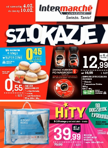 {loadposition linkIntermarche} Nowa gazetka promocyjna sieci handlowej Intermarche - "Sz!okazje". Polecane promocje z gazetki Intermarche: Pączek Janczewscy 1 sztuka - 0,55 zł. Kawa rozpuszczalna Nescafe 200 g - 12,99 zł. Kołdra 4 pory roku Wendre - 39,99 zł. …