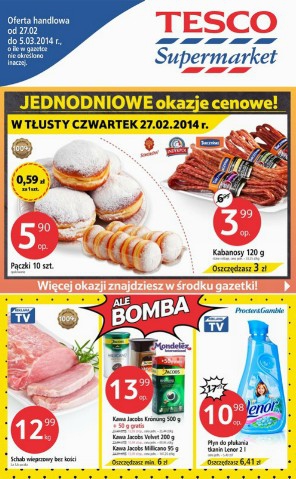 Nowa gazetka promocyjna Tesco - "Jednodniowe okazje cenowe!". Polecane promocje z gazetki Tesco: Pączki 10 sztuk - 5,90 zł. Kabanosy 120 g - 3,99 zł. Płyn do płukania tkanin Lenor 2 L - 10,98 zł. Oferta ważna…
