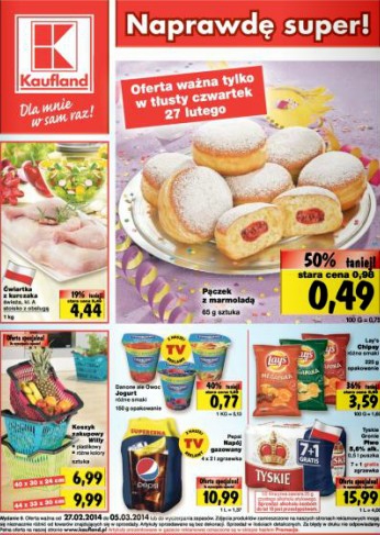 {loadposition linkKaufland} Nowa gazetka promocyjna marketu Kaufland - "Naprawdę super!". Polecane promocje z gazetki Kaufland: Pączek z marmoladą - 0,49 zł. Jogurt Danone Ale Owoc 150 g - 0,77 zł. Pepsi 4x2 L - 10,99 zł. Oferta…