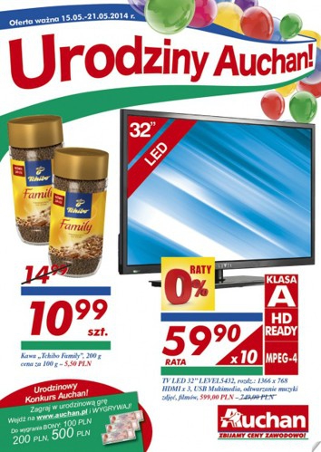 {loadposition linkAuchan} Nowa gazetka promocyjna Auchan - "Urodziny Auchan!". Polecane promocje z gazetki Auchan: Telewizor LED 32" LEVEL5432 - 599 zł. Kawa rozpuszczalna Tchibo Family 250 g - 10,99 zł. Pączek z lukrem różne smaki - 0,65 zł. …