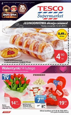 Nowa gazetka promocyjna Tesco. Polecane promocje z gazetki Tesco: Pączki wieloowocowe z cukrem pudrem Tesco 10 sztuk - 4,90 zł. Bukiet czerwonych tulipanów 15 sztuk - 14,99 zł. Serce pluszowe 30 cm - 19,99 zł. Oferta ważna…