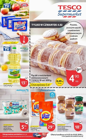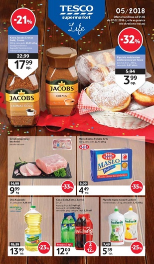 Nowa gazetka promocyjna sieci sklepów Tesco. Polecane promocje z gazetki Tesco: Kawa rozpuszczalna Jacobs Cronat Gold lub Crema 200 g - 17,99 zł. Pączki z nadzieniem wieloowocowym Tesco 6 sztuk - 3,99 zł. Schab wieprzowy bez kości 1…