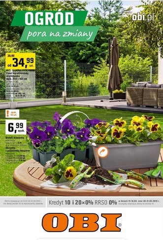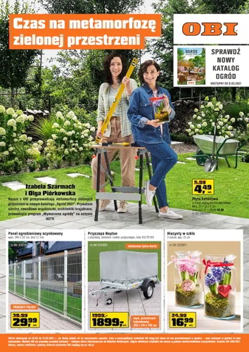 {loadposition linkObi} 'Ogród - pora na zmiany' - nowa gazetka promocyjna sieci marketów Obi. Polecane promocje z gazetki Obi: Panel ogrodzeniowy ocynkowany wym. 250x152 cm - od 34,99 zł. Tunel foliowy wzmocniony - od 349 zł. Domek ogrodowy Manor…