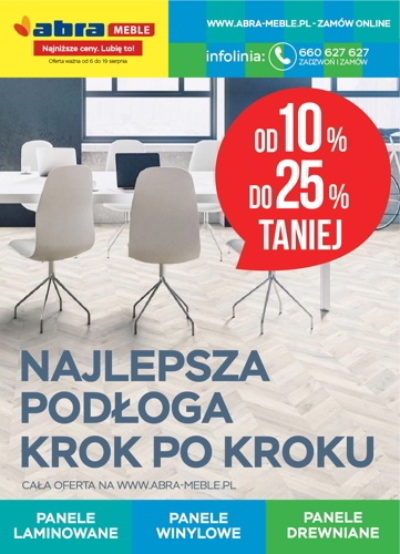 {loadposition linkAbra} 'Najlepsza podłoga krok po kroku' - nowa gazetka promocyjna sieci sklepów Abra Meble. Polecane promocje z gazetki Abra Meble: Panel podłogowy Dąb Bergen 2594 Swiss Krono m² - 28,95 zł. Panel podłogowy Dąb Benito 3280 Swiss Krono…