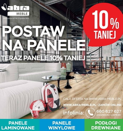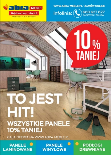 {loadposition linkAbra2} 'To jest hit! Wszystkie panele 10% taniej' - nowa gazetka promocyjna sieci sklepów Abra Meble. Polecane promocje z gazetki Abra Meble: Panel podłogowy Dąb Benito 3280 Swiss Krono m² - 44,95 zł. Panel podłogowy Dąb Vivo 3282…