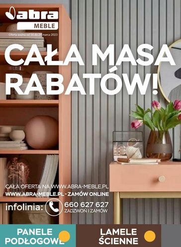 'Cała masa rabatów' - nowa gazetka promocyjna sieci sklepów Abra Meble. Polecane promocje z gazetki Abra Meble: Panel podłogowy Wiąz Amaranta 5375 Swiss Krono m² - 44,95 zł. Panel podłogowy Dąb Artemida 5380 Swiss Krono m² - 44,95 zł.…