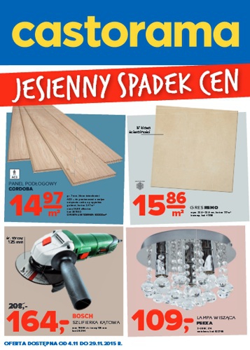 {loadposition linkCastorama} Nowa gazetka promocyjna sieci handlowej Castorama - "Jesienny spadek cen". Polecane promocje z gazetki Castorama: Panel podłogowy Cordoba m² - 14,97 zł. Gres Remo m² - 15,86 zł. Szlifierka kątowa Bosch 700 W - 164 zł. …