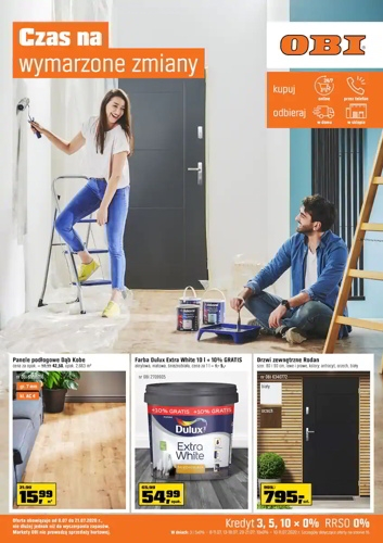 {loadposition linkObi} 'Czas na wymarzone zmiany' - nowa gazetka promocyjna sieci marketów Obi. Polecane promocje z gazetki Obi: Panele podłogowe Dąb Kobe m² - 15,99 zł. Farba Dulux Extra White 11 L - 54,99 zł. Drzwi zewnętrzne Rodan -…