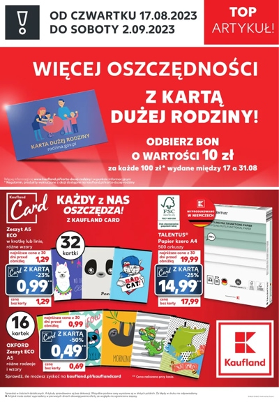{loadposition linkKaufland4} 'Top Artykuł!' - nowa gazetka promocyjna sieci marketów Kaufland. Polecane promocje z gazetki Kaufland: Zeszyt ECO A5 32 kartki - 0,99 zł*. Papier ksero A4 Talentus 500 arkuszy - 14,99 zł**. Zeszyt ECO Oxford A5 16 kartek…