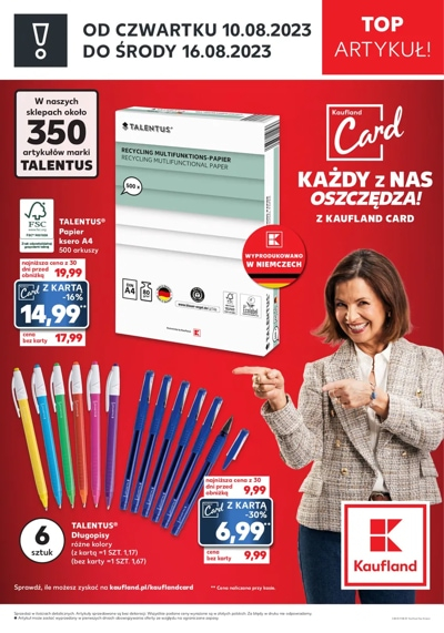 {loadposition linkKaufland7} 'Top Artykuł!' - nowa gazetka promocyjna sieci marketów Kaufland. Polecane promocje z gazetki Kaufland: Papier ksero A4 Talentus 500 arkuszy - 14,99 zł*. Długopisy Talentus 6 sztuk - 6,99 zł**. Tornister Loop Herlitz - 199,90 zł. …