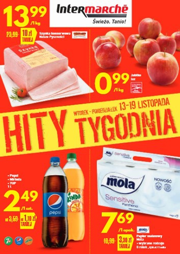 {loadposition linkIntermarche} 'Hity tygodnia' - nowa gazetka promocyjna sieci sklepów Intermarche Polecane promocje z gazetki Intermarche: Szynka konserwowa Nasze Pyszności 1 kg - 13,99 zł. Pepsi, Mirinda lub 7Up 1 L - 2,49 zł. Papier toaletowy…